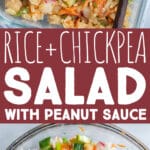 This Rice and Chickpea Salad with Peanut Sauce is packed with tons of veggies and protein! It can be enjoyed warm or cold and is perfect for meal prep lunches that will fill you up with plant based protein. The homemade peanut sauce is super easy and adds so much flavor to this delicious vegan rice salad.