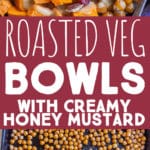 - Assemble your bowls: Add a few big spoonfuls of quinoa to the bottom of your bowl and then top with the roasted veggies and chickpeas. Drizzle over desired amount of honey mustard dressing and then top with any other desired toppings (pecans, dried cranberries, avocado, hummus, fresh herbs, etc.), and enjoy!