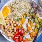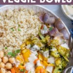 If you want to add more vegetables to your diet this year, these easy Roasted Rainbow Veggie Bowls with Citrus Tahini Sauce are the perfect way! These healthy, plant-based bowls are customizable to your taste and great served with protein-packed quinoa, and chickpeas. The citrus-tahini dressing brightens everything up and adds creaminess.