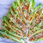 I don’t usually make such festive-looking recipes, but I saw someone make a version of this Romaine Lettuce Christmas Tree Salad on social media, and I had to make one! This version is Greek-inspired and topped with a delicious creamy tahini dressing.