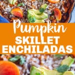 These Pumpkin Skillet Enchiladas are my new favorite meal! You know I love a good skillet enchilada recipe, and this one is packed with cozy fall flavors, tons of healthy vegetables, and black beans. I made these skillet enchiladas this morning and happily ate them for lunch and dinner 🙂