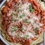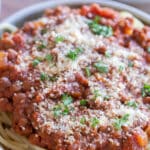 My Spaghetti with Meaty Lentil Sauce is a nutrient packed vegetarian dinner that comes together quickly. This hearty pasta recipe is great for an easy weeknight meal that the whole family will love. The lentils help bulk the sauce up and add both fiber and protein to this dish. Serve with a side of salad and bread for a full meal.