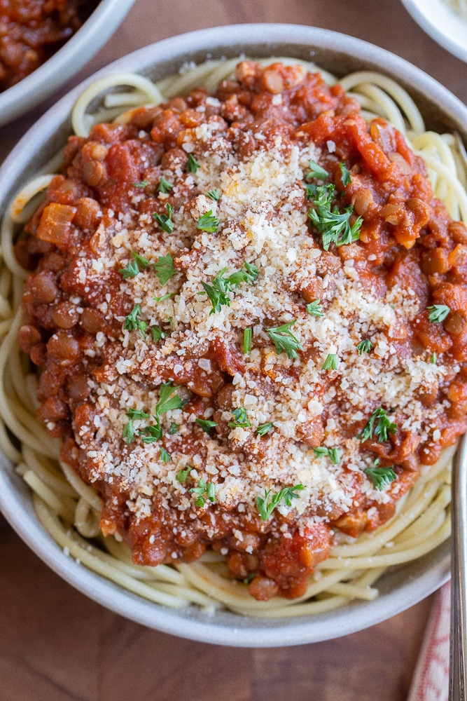 - Serve the meaty lentil sauce over spaghetti or your favorite pasta. You can also mix the spaghetti directly into the sauce if you wish. Top with fresh parsley and grated parmesan and enjoy with a side of salad and bread.