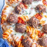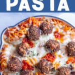 - Add pasta to a large baking dish, whatever shape you like, and spread pasta out. Next, top with about 3/4 of the grated cheese. Then, place the meatballs on top of the pasta and gently press them down a little bit. Top with remaining cheese and cover with foil.