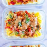 Just put an equal amount of the spaghetti squash, veggie chickpea mixture, and peanut sauce into your meal-prep containers and store them in the refrigerator for up to 4-5 days.