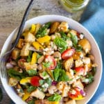 It’s packed with crispy chunks of bread, fresh vegetables, hearty white beans, tangy feta cheese, and dressed with a delicious basil vinaigrette. Now, if that doesn’t make your mouth water, I don’t know what will! I first saw Ina Garten make a panzanella salad on Barefoot Contessa, and I’ve been hooked ever since. I’ve made quite a few varieties on the blog, and I still have trouble picking a favorite one. This spinach and white bean one ranks pretty high, though!