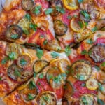 Craving a fresh, summer-themed pizza for your next pizza night? This Summer Squash and Tomato Pizza has all the fresh flavors of summer in one cheesy and delicious bite! The squash is caramelized to perfection, adding so much flavor to this colorful vegetarian pizza recipe.