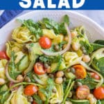 - Can this tortellini salad be made ahead of time? Yes, it can be made ahead of time. The only thing to watch out for is that the arugula may wilt a bit if it’s in the refrigerator for more than one or two days.