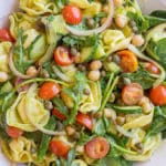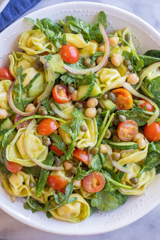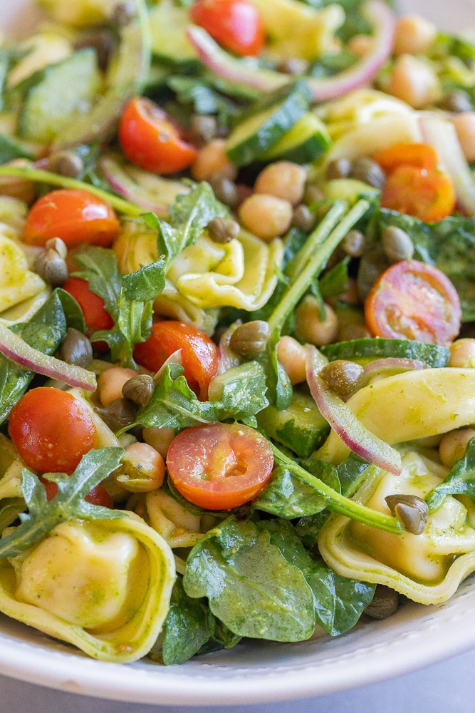 - To a large bowl, add the cooled tortellini, chickpeas, arugula, tomatoes, red onion, and capers. Next, pour the dressing over the pasta salad and mix everything together until fully combined. Season with extra salt and pepper, if needed.