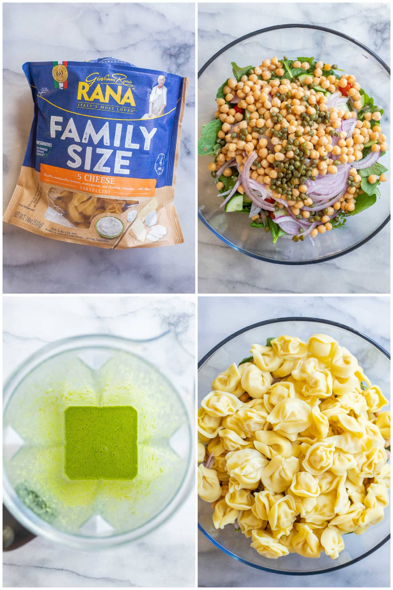 - To a large bowl, add in your cooled tortellini, chickpeas, arugula, tomatoes, red onion and capers. Next, pour the vinaigrette over the pasta salad and mix everything together until fully combined. Season with extra salt and pepper, if needed.