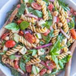 Fourth of July is just a few days away, and this Tahini Balsamic Pasta Salad is the perfect side dish to bring to a holiday picnic or BBQ. It’s healthy, full of fresh veggies, and filling enough to enjoy as a main dish.