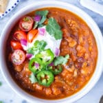 I have a few different chili recipes on my site (because I love them so much), and this one is probably neck and neck with my Best Vegan Chili Recipe. This recipe is actually vegan as well, but I did top mine with some non-fat Greek yogurt. I call this the best vegetarian chili recipe because it has so many veggies.