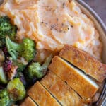 - Potatoes – I like to mix regular potatoes and sweet potatoes for the mashed potatoes in these bowls. Sweet potatoes are always a favorite on Thanksgiving and add extra nutrients to the mashed potatoes. The potatoes get flavored with milk, butter, salt, and pepper.